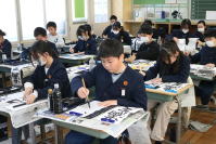 1,2校時に書き初め会を行いました。1,2年生は鉛筆で、3年生以上は毛筆で書きました。練習の成果を発揮できるように、集中して書きました。
