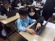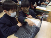 市から支給されているタブレット端末が新しくなりました。その端末には、新しいパスワードを入力する必要があります。そこで5年生が1年生一人一人にパスワードの入力の仕方を教えに行きました。「次はここを押して」「数字はここだよ」など優しく声をかけながら教えていました。何度も練習するうちに、1年生は自分のパスワードをすらすら入力できるようになりました。5年生の皆さん、ありがとうございました。