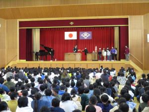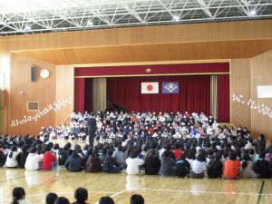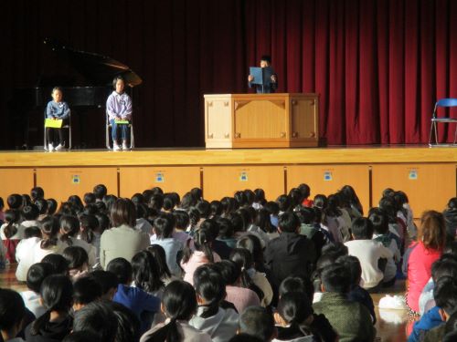 |  11月の学校集会を行いました。校長先生のお話では、11月の行事であった修学旅行・音楽発表会・小中音楽会等でのがんばりをほめていただきました。その後、表彰を行い、最後に学校生活についてのお話がありました。  |