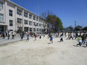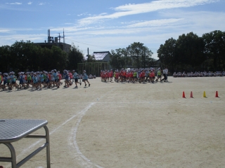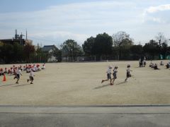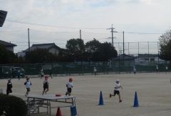 |  体育の授業の中で、かけ足運動に取り組んでいます。声援を受けながら、自分のペースでがんばって走っています。  |