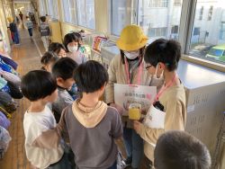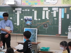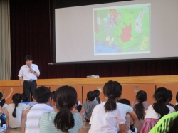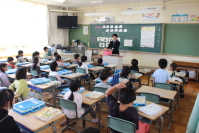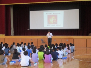 |  3年生の社会科「火事からくらしを守る」の単元で、実際に火事を体験した方を招いて、お話を聞く会を開きました。子どもたちは、講師の先生の体験談をとても真剣に聞いていました。 |