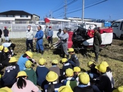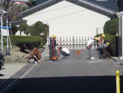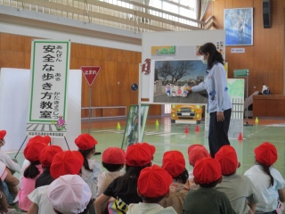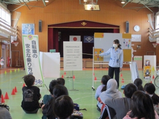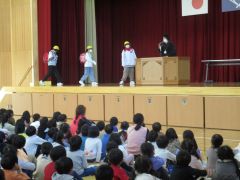 |  1年生を対象に歩き方教室が行われました。交通指導員の方々の指導のもと、2人1組となり、安全確認の仕方や、横断歩道・踏み切りの渡り方など、実際にコースを歩きながら指導をしてもらいました。 |