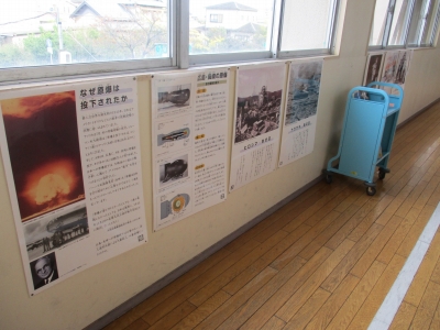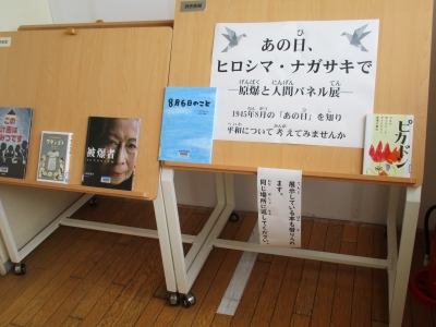 |  広島・長崎に落とされた原子爆弾についてのパネルの展示を、図書室の廊下を利用して行っています。学校司書の方が原爆に関する本を選んで、パネルと一緒に展示してくれました。 |