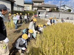 |  5年生が、営農改善組合の方と一緒に、稲刈り体験を行いました。大きく成長し た稲を、のこぎり鎌を使用し、安全に気をつけて刈り取りました。  |