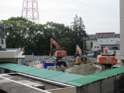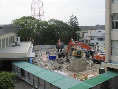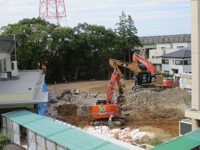 |  渡り廊下から、工事の様子を見ると、 旧体育館がすべて取り壊されました。今後は、校舎から体育館までの渡りを建設したり、駐車場をつくったりと、まだまだ工事は続いていきます。  |