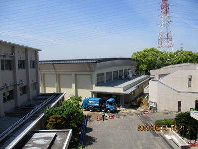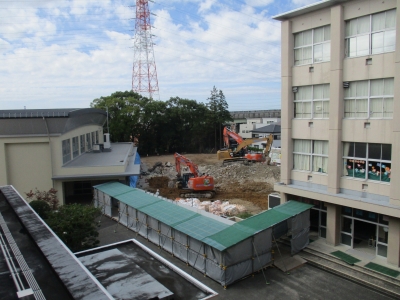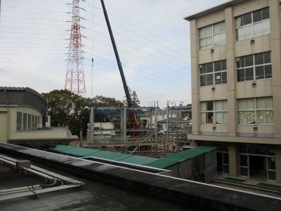 |  渡り廊下から、工事の様子を見ると、先週まではあった壁や屋根も取り壊され、体育館がすべて取り壊されていました。校舎から体育館までの渡りを建設したり、駐車場をつくったりと、まだまだ工事は続いていきます。 |