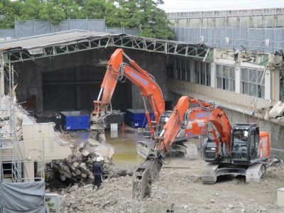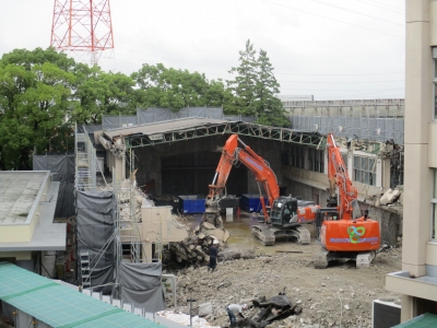 |  新体育館の横では、旧体育館の解体工事が行われています。屋根も半分ほど壊され、体育館の中があらわになっています。  |