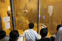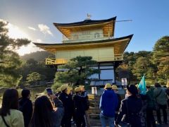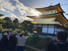 |  金閣寺では、クラスごとに見学をしました。太陽に照らされて、金閣寺が輝いています。近くでも見ても、遠くから見てもとてもきれいです。 |