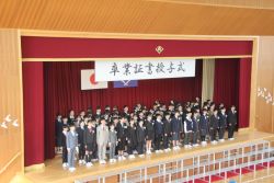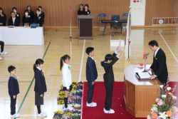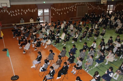 |  天候にも恵まれ、新しい体育館での最初の卒業式が行われました。今年度は、5年生も参加しました。6年間の思い出を胸に、132名の児童が全員そろって卒業しました。