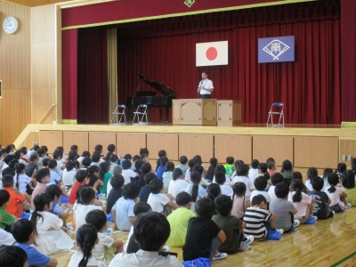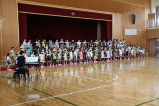|  新体育館になってからの初めての行事「2・4・6年音楽会」を行いました。冷房がきいた、新しい体育館中で、どの学年もきれいな歌声を響かせました。11月の音楽会は、1・3・5年、ひまわり学級です。  |