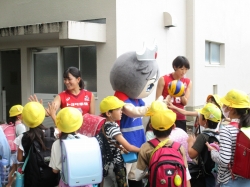 |  トヨタ車体、女子バレーボールチーム「クインシーズ」の選手が、朝のあいさつ運動に来てくれました。マスコットのクインちゃんも登場し、子どもたちの人気を集めていました。   |