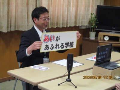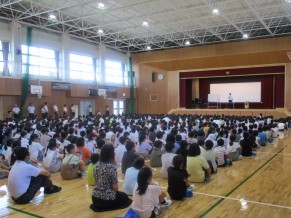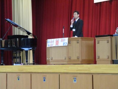 |  今月も、校長先生からは、「あいがあふれる学校」についてお話があり、よいところをほめていただきました。また、写真を用いて新体育館の紹介もありました。新体育館の様子を分かりやすく伝えていただきました。  |