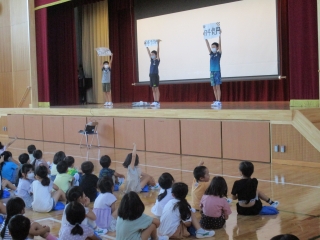 |  1学期終業式を新体育館で行いました。新体育館が完成し、初めて全校の児童が新体育館に入りました。終業式後の学校集会では、児童会主催の「新体育館オープニングセレモニー」を行い、インタビューやクイズなどをしました。  |