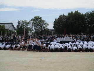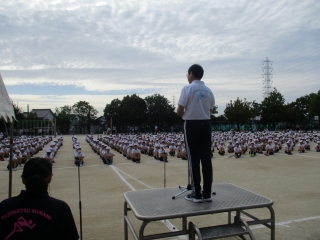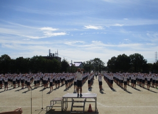 |  本日は、屋外での暑さも和らぎ、熱中症指数も高くはならなかったので、運動場で練習を行いました。休憩や水分補給を取り入れながら、隊形を確認したり、演技を通したりしました。 |