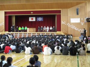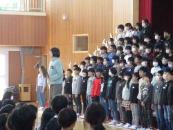 4時間目に、卒業生とのお別れ式を体育館で行いました。在校生の代表からのお祝いの言葉と、卒業生のお別れの言葉があり、その後、全校で校歌を歌いました。