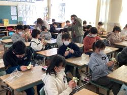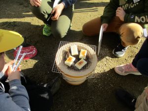 |  3年生が七輪体験を行いました。炭火をおこすのに少し苦労しましたが、グループで協力して炭火をおこし、おもちを焼いて食べました。  |