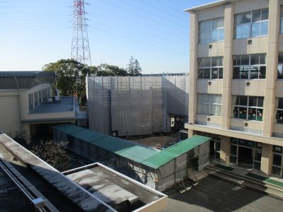 |  北舎から、新体育館への渡り通路の工事の様子です。北舎2階からと、1階から体育館へとつなぎます。今は、工事をしている部分は囲われています。完成したら、駐車場の工事が行われます。  |
