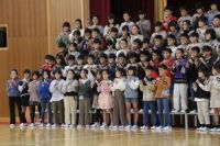 |  ありがとう集会の第1部は、お世話になった地域の方々に感謝をする会です。お世話になったお礼に、花とお礼の手紙をお渡ししました。代表の方からのお話の後、全校で「あなたにありがとう」を歌いました。  |