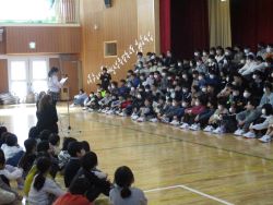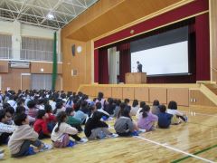 |  12月の学校集会では、人権週間にかかわって、校長先生から人権に関する内容のお話がありました。また、人権担当の先生が、人権に関する絵本をスクリーンに投影して、読み聞かせを行いました。  |