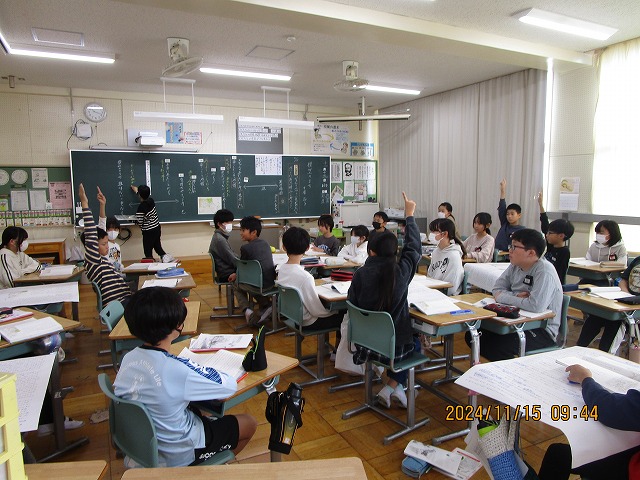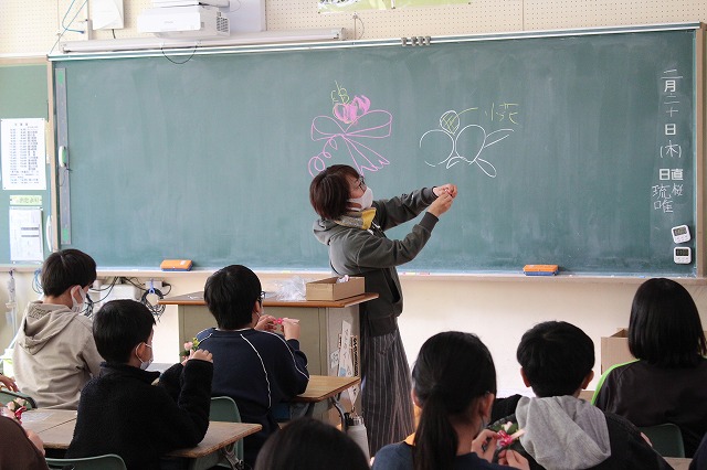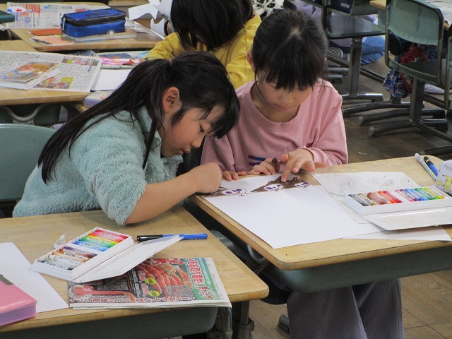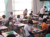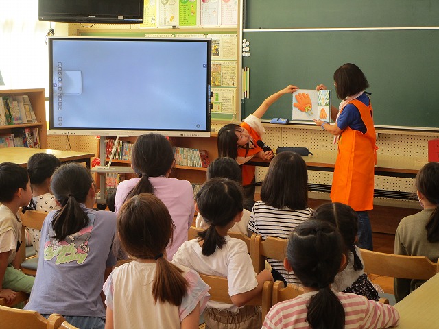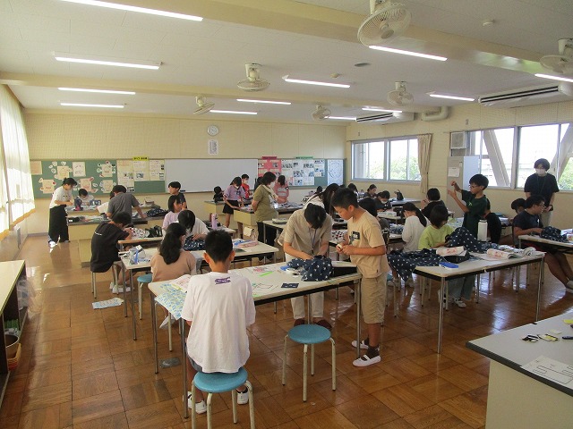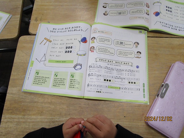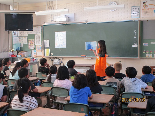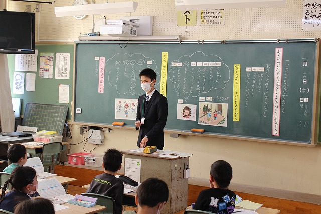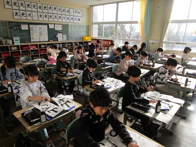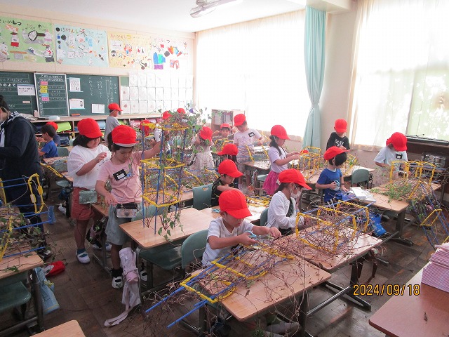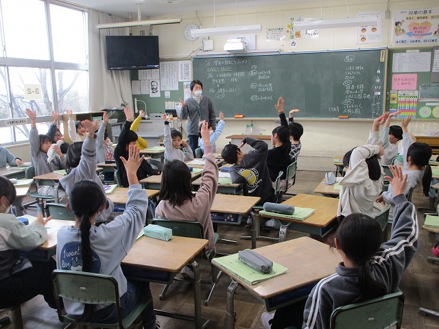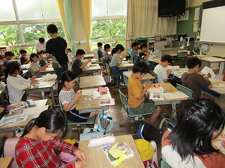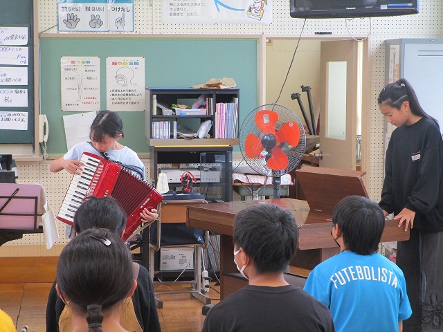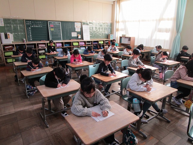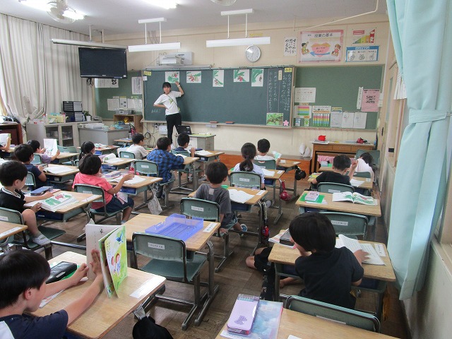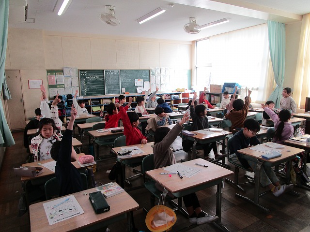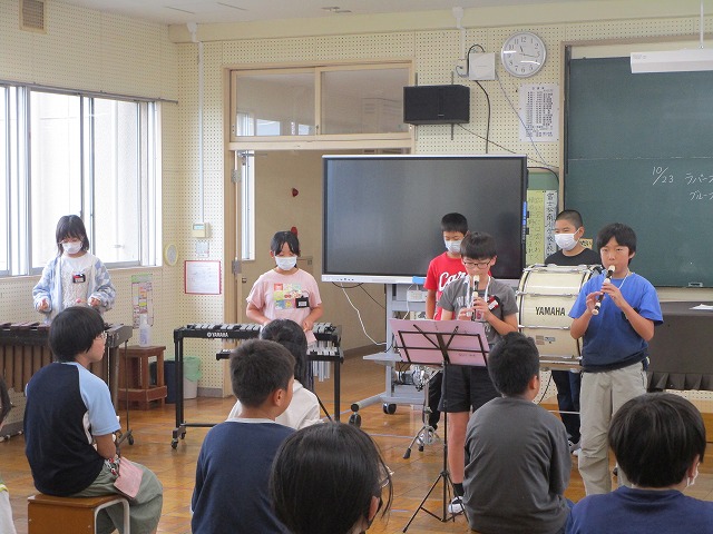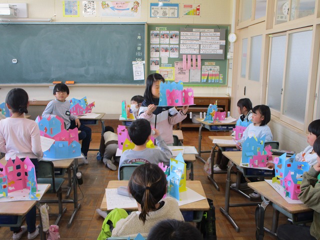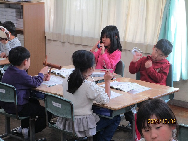 2年生が教室で図工作品の鑑賞会を行っていました。素敵だなと思ったクラスメイトの作品のよいところを、他の子にも知ってもらおうと、堂々と発表する姿が見られました。3年生は、音楽の授業でお囃子を体験していました。最後は、たくさん練習してきた歌の中から「帰り道」を選んで歌っていました。3年生らしい伸びやかな歌声でした。