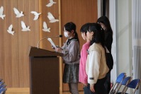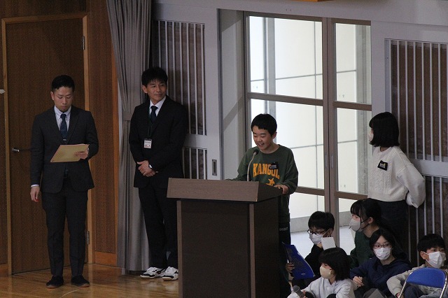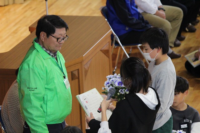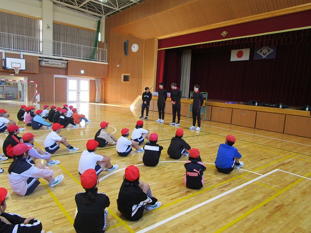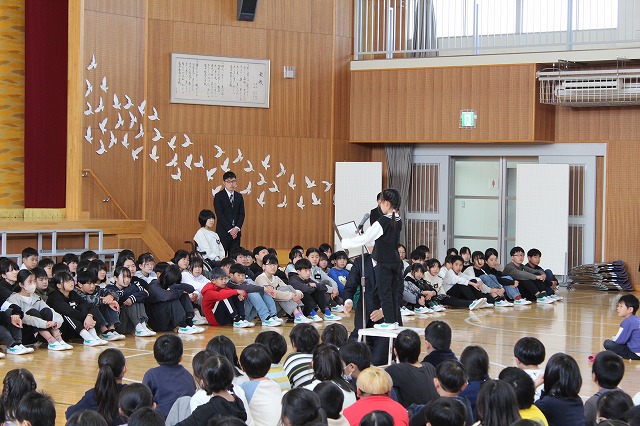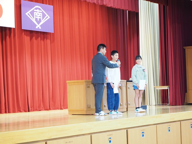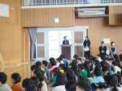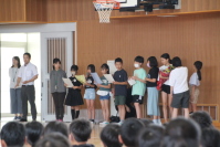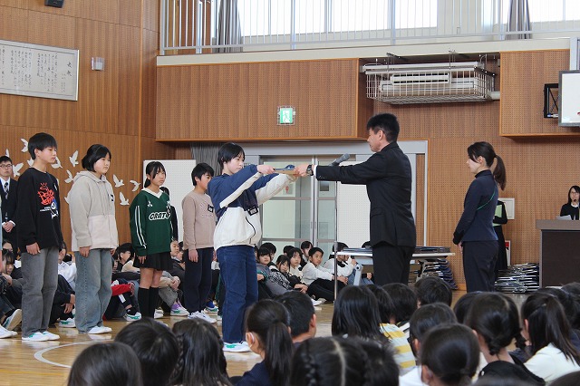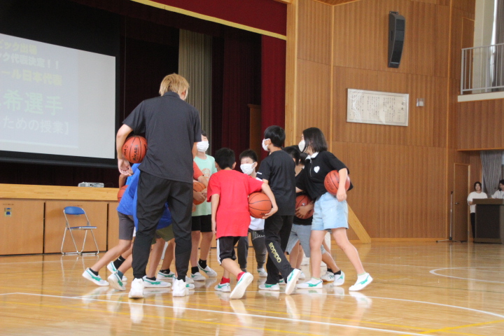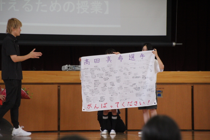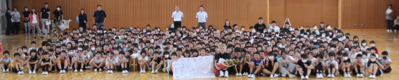 その後は、児童会の主催で、オリンピック壮行会が行われました。代表児童が激励の言葉を贈った後、全校児童からの手紙、バスケットボール部からの寄せ書き、花束を贈呈しました。髙田選手も「元気いっぱいの子どもたちに勇気をもらいました」と喜んでみえました。 |