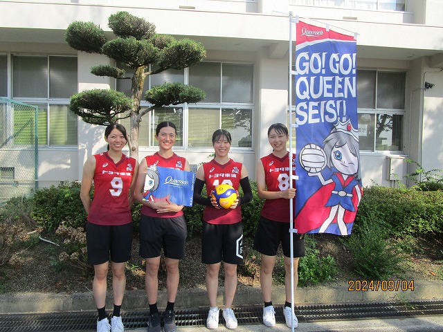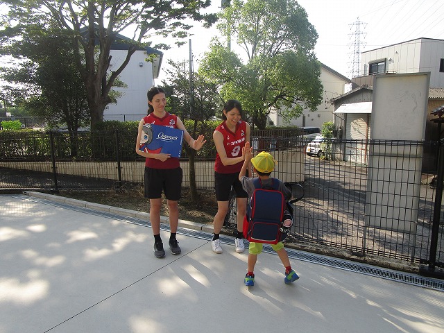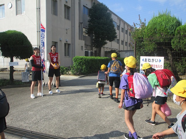 「クインシーズ刈谷」の選手が朝のあいさつ運動に来てくださいました |