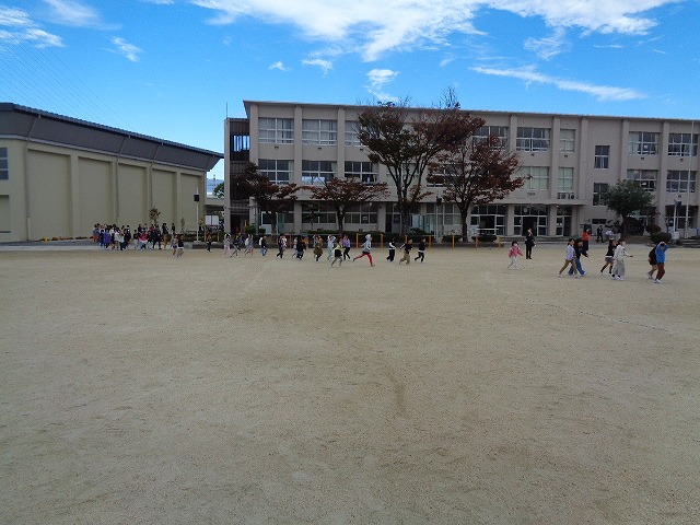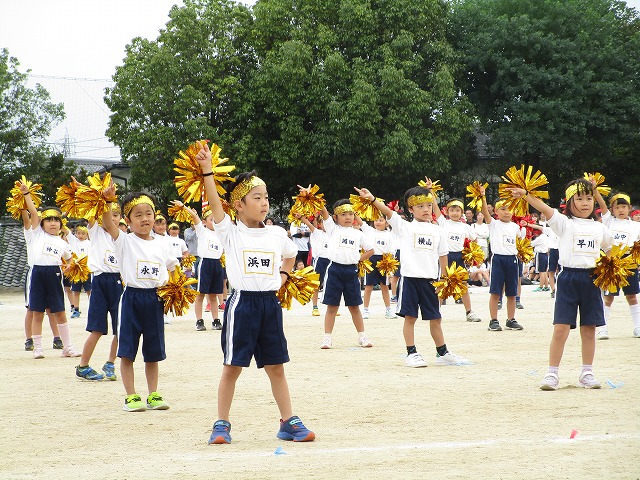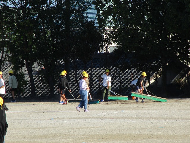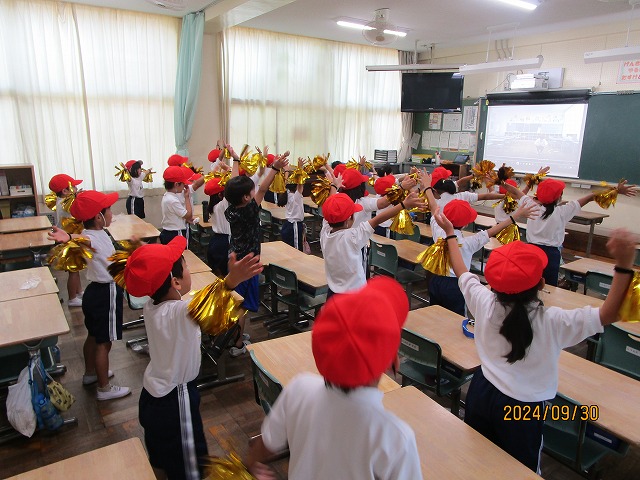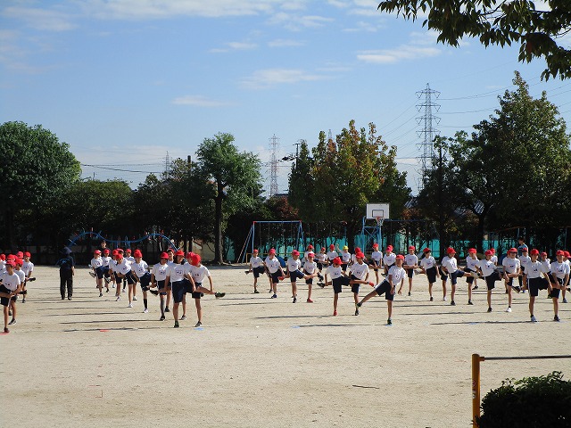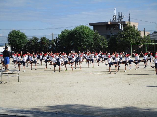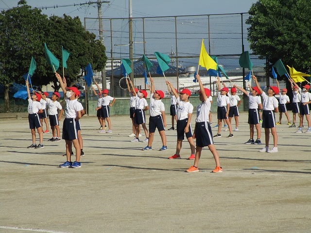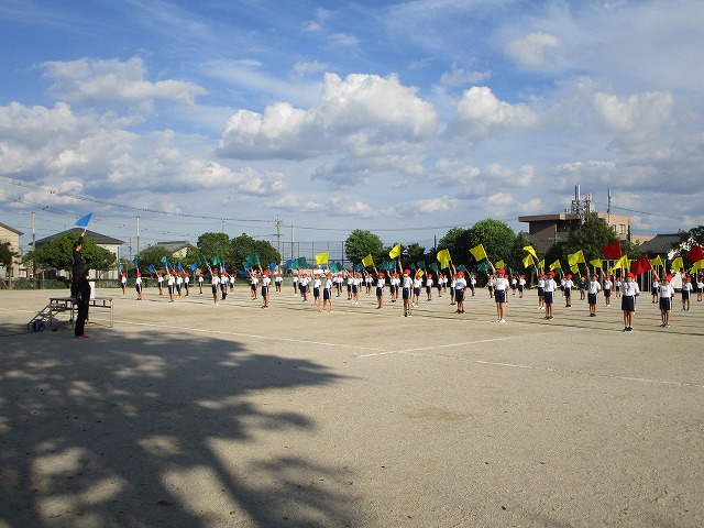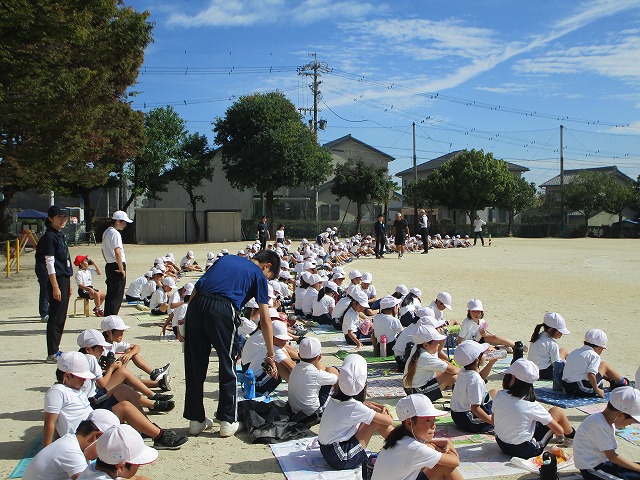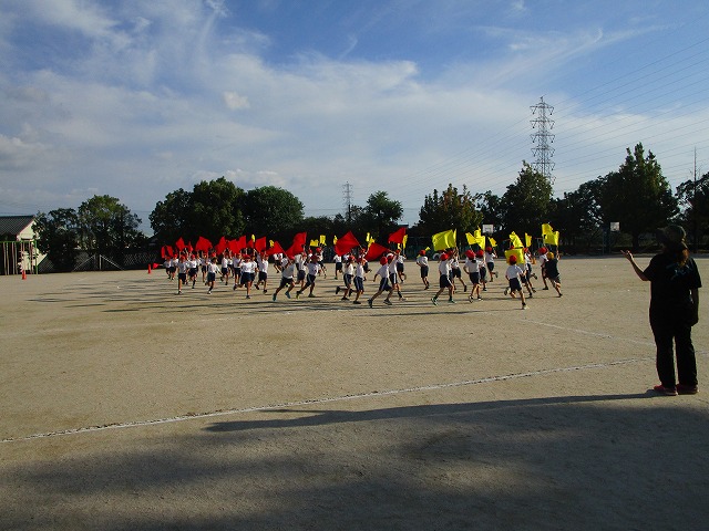 予行演習の日です。すっきりと晴れました。全校練習が天候により中止になっていたので、全校児童が揃うのは今日が初めてです。先生の指示をよく聞いて、高学年の様子をよく見て、低学年の児童も立派に参加していました。