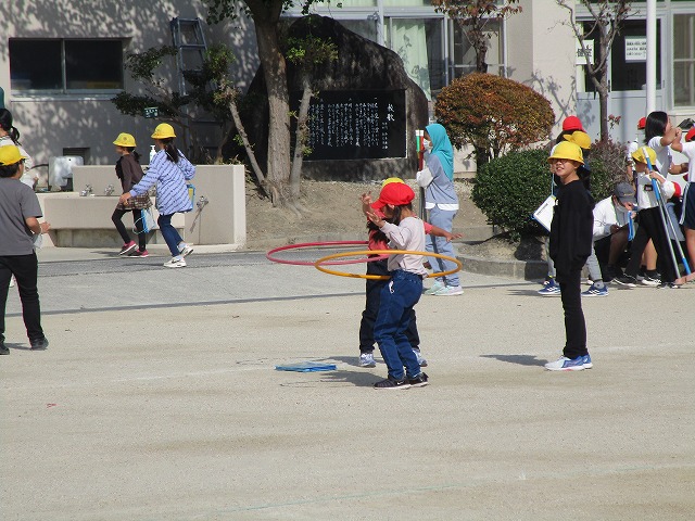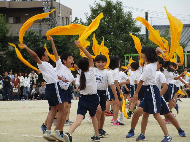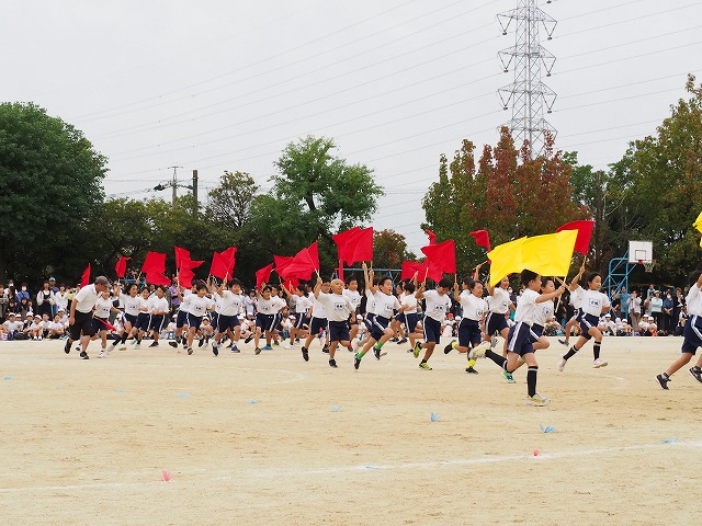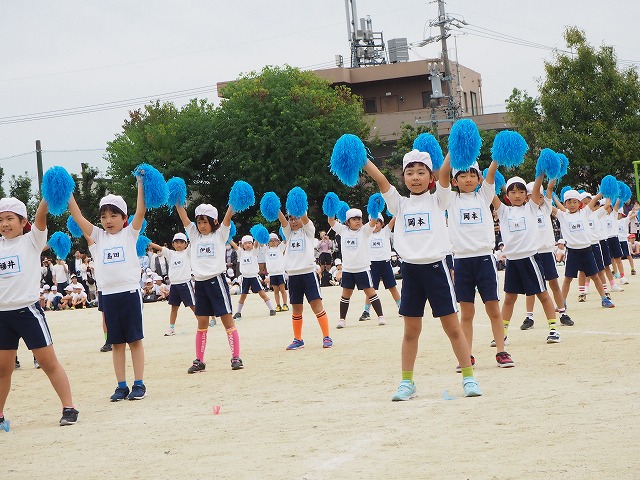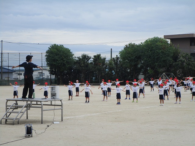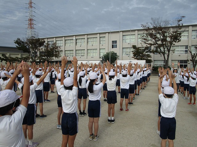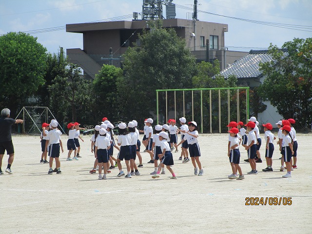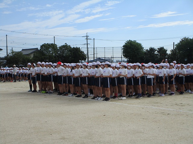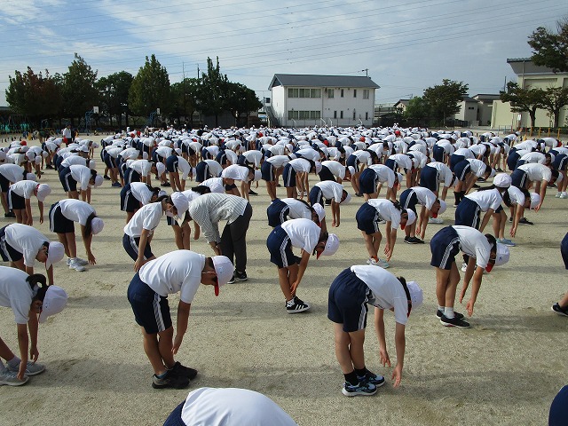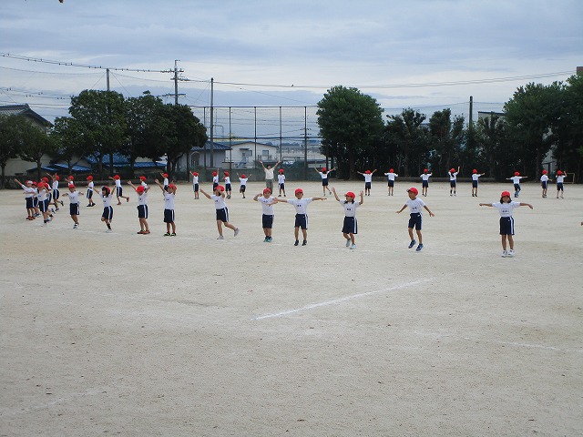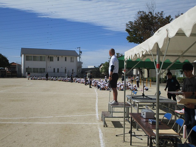 予行演習の日です。すっきりと晴れました。全校練習が天候により中止になっていたので、全校児童が揃うのは今日が初めてです。先生の指示をよく聞いて、高学年の様子をよく見て、低学年の児童も立派に参加していました。