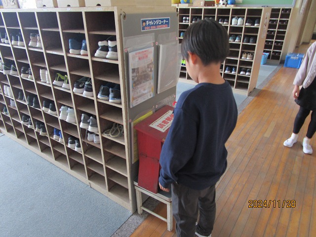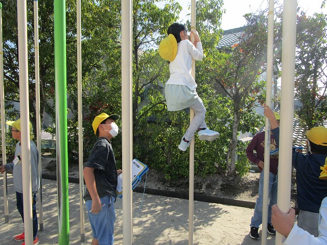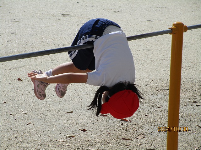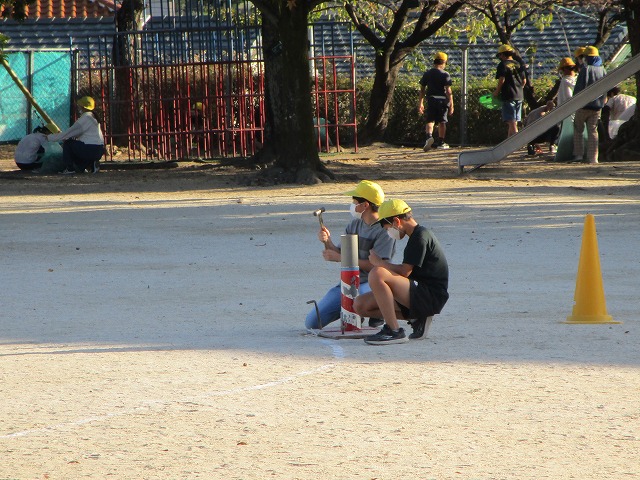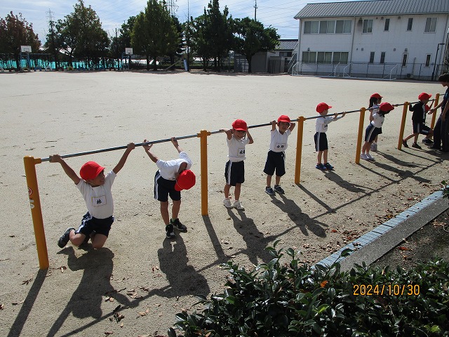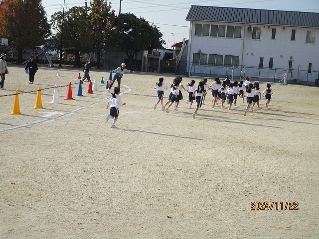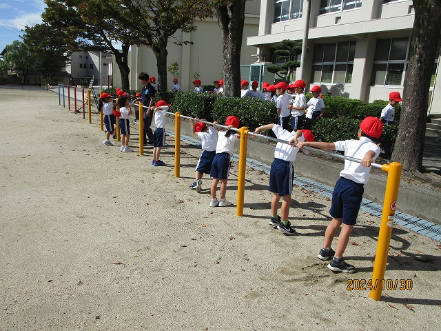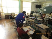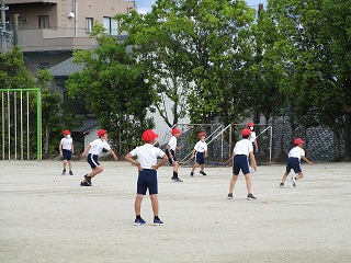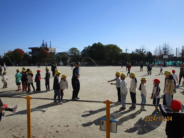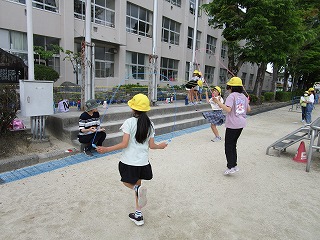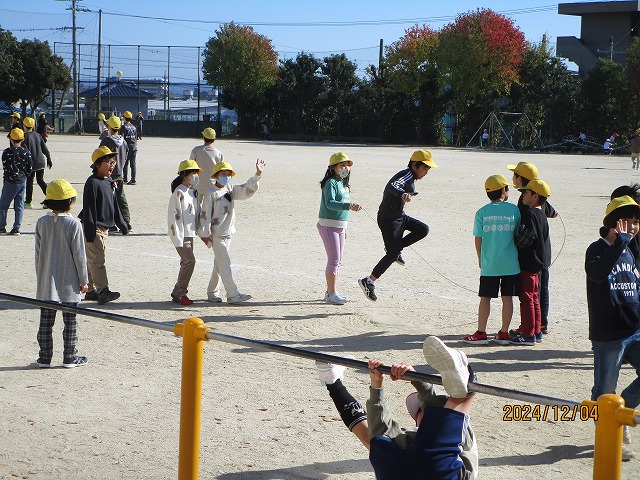 長縄跳びをしているクラスがあります。休み時間になると皆で運動場に集合し、先生も一緒になって長縄の記録に挑戦しています。長縄が苦手な子に、縄に入っていくタイミングを上手に教えている仲間の姿が見られます。
