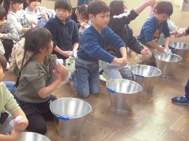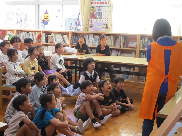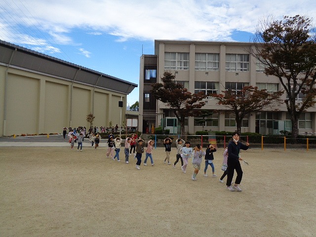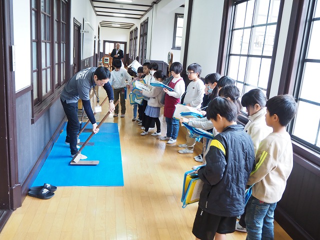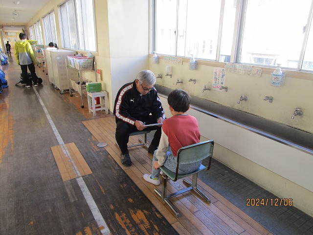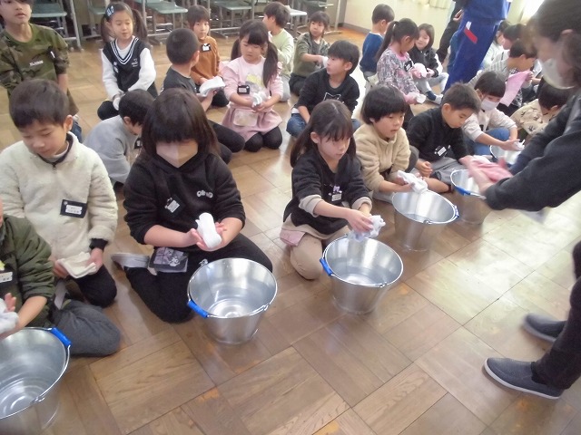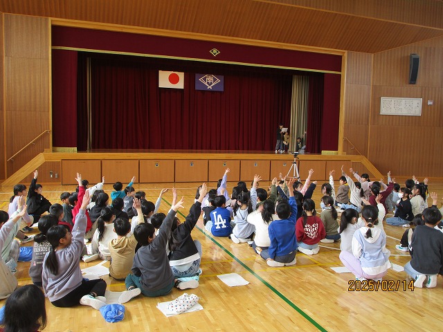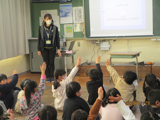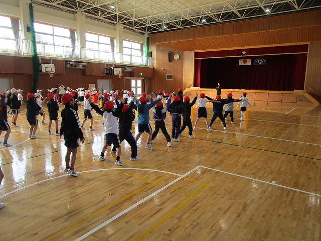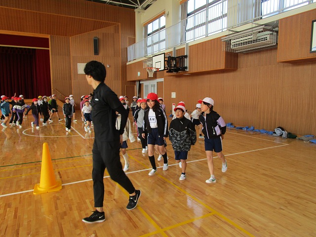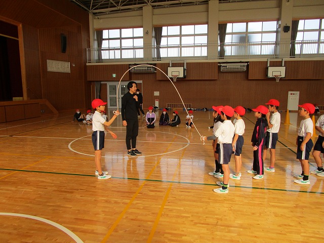 今日は1年生がからだつくり運動講習会に参加しました。楽しく準備運動をして体をじゅうぶん温めた後、縄跳びを上手に跳ぶこつを教えてもらいました。8の字跳びを跳んだ後、どこに向かって走っていったらいいのか分かった子どもたちがたくさんいました。