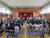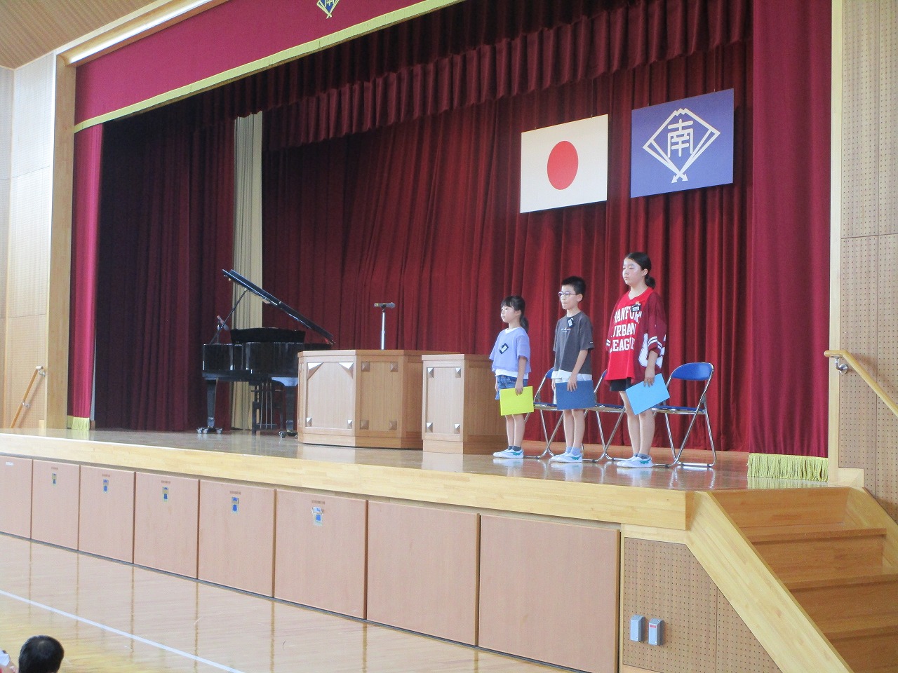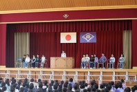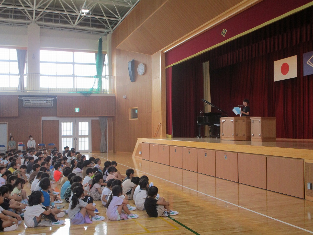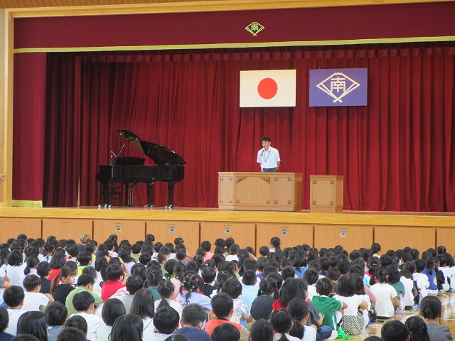始業式では、まず、校長先生から、「仲間と高め合える2学期にしましょう」「たくさん挑戦し、たくさんの経験ができる2学期にしましょう」というお話がありました。次に、全校で校歌を歌いました。