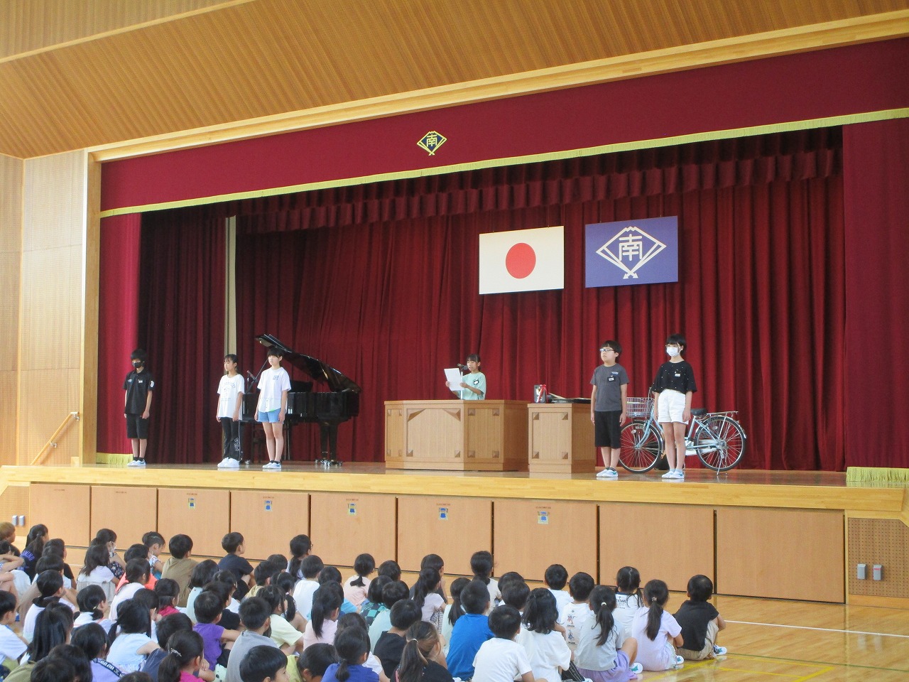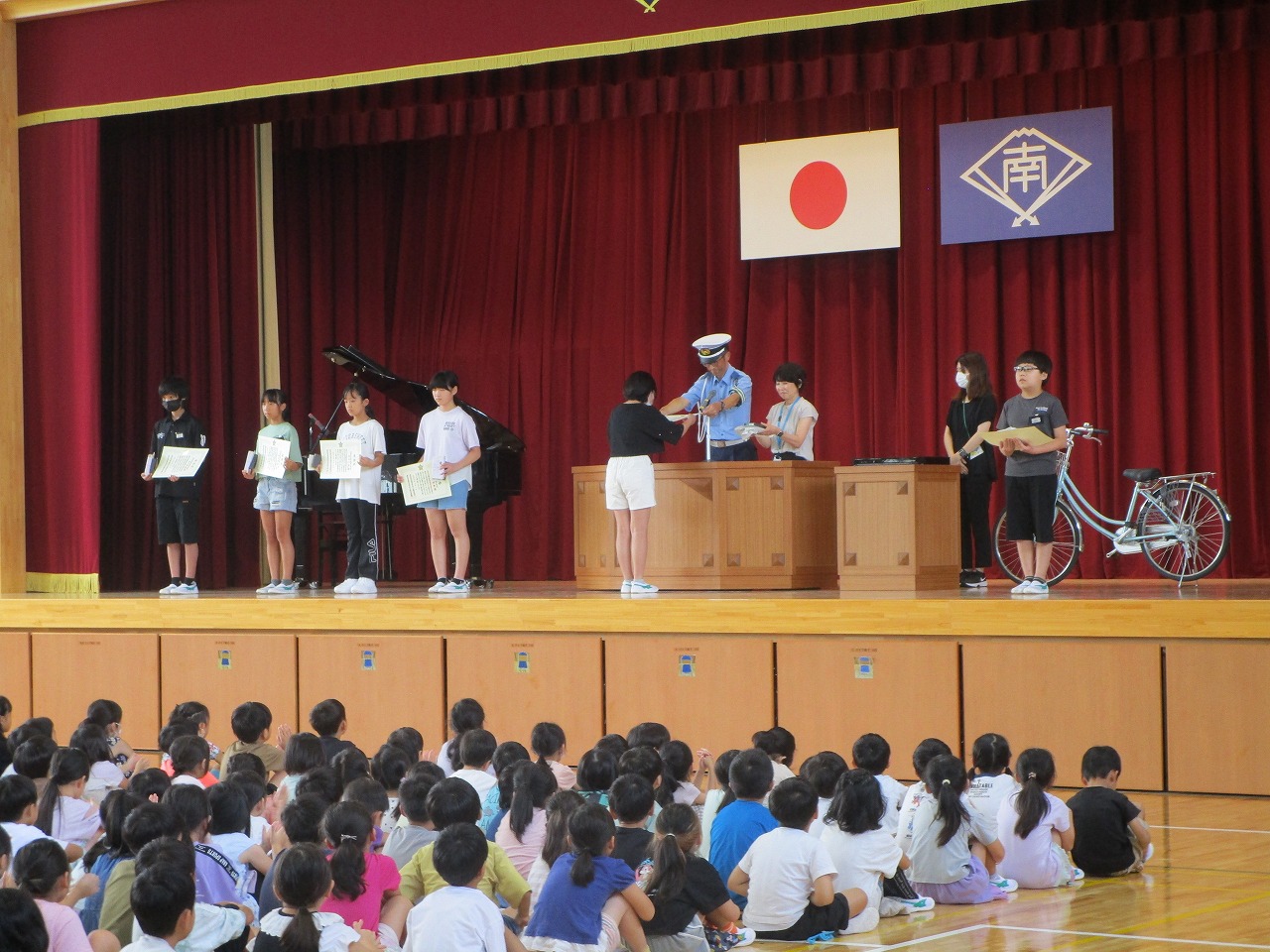7月23日(火)、自転車部の愛知県大会がありました。実技テストの練習や学科テストの勉強の成果を存分に発揮し、第6位入賞を果たしました。今日の全校集会に、警察署の方、交通安全協会の方、刈谷市くらし安心課の方も来校されて表彰式が行われ、賞状や記念品が授与されました。