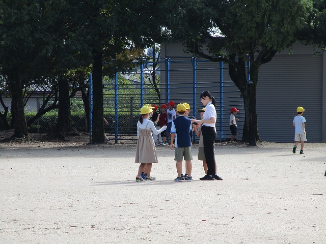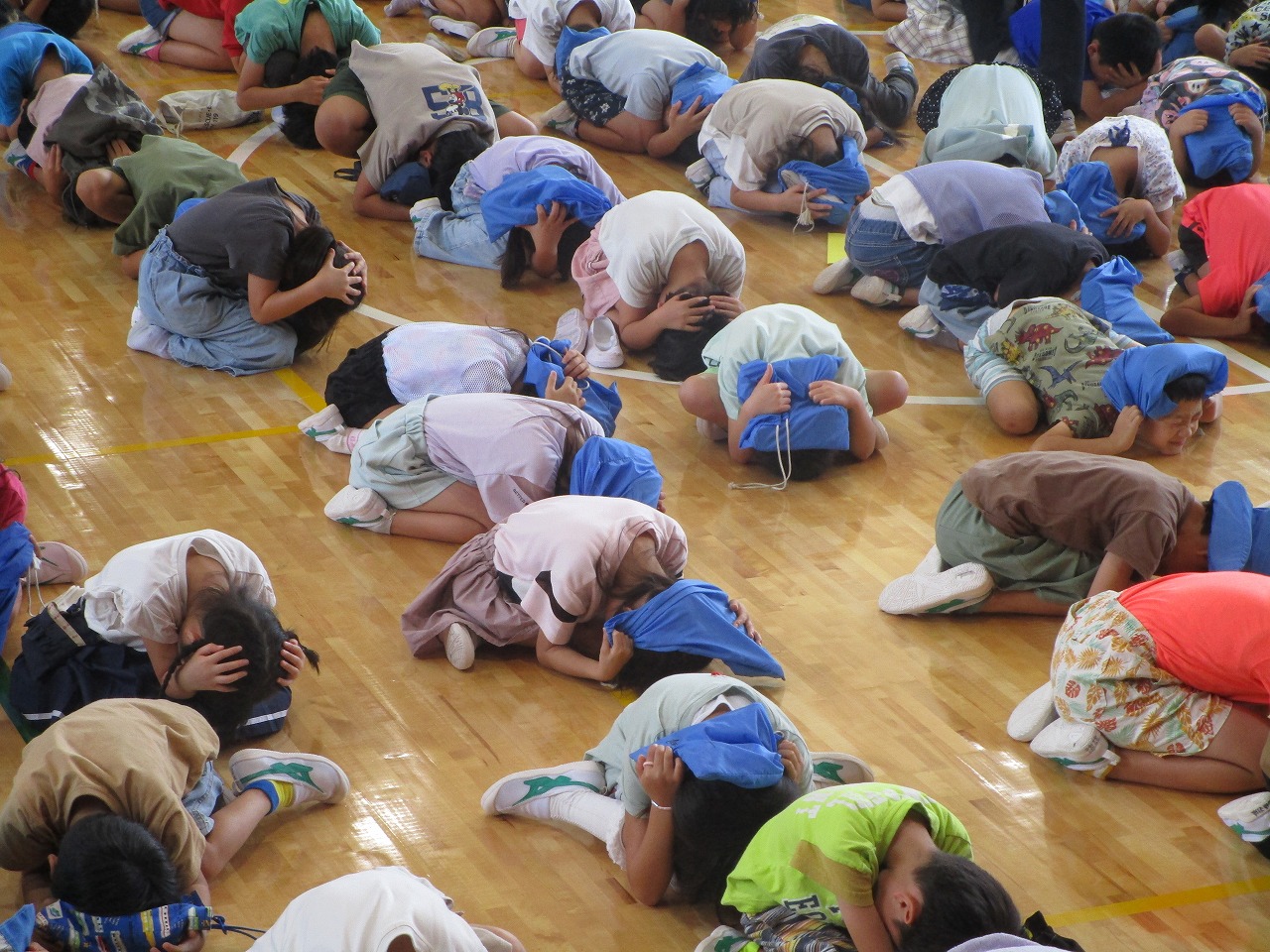 今年度、初めての避難訓練。緊急地震速報が発表された場合の行動の仕方とその後の火災発生時の避難方法を確認しました。全員無事に早く避難することができました。