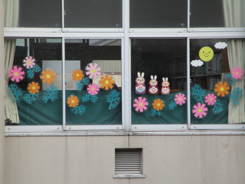 図書館の窓はいつも素敵な掲示物で彩られています。今は、秋の花や、運動会の掲示物が飾られています。ボランティアの皆さんが季節や行事に合わせ、図書館の中からも外からも楽しめるように環境を整えてくださっています。子どもたちも教職員も「次はどんな掲示かな?」と楽しみにしています。
