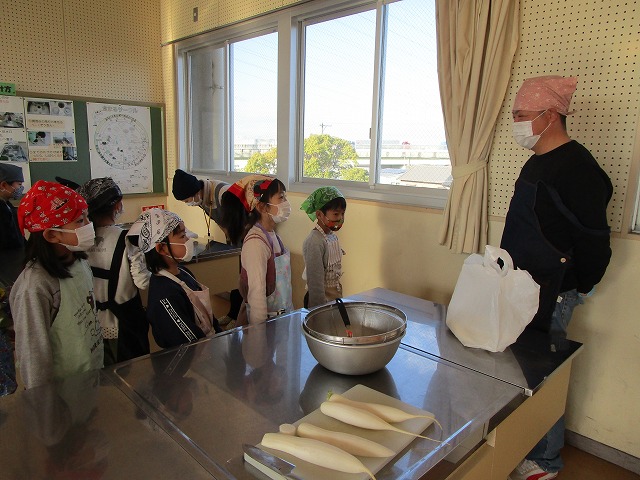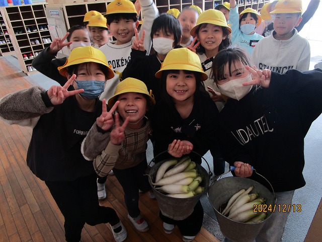昇降口がにぎやかだなぁと思って確認に行くと、2年生が大根の収穫から戻ってきたところでした。バケツの中には、みずみずしい大根がたくさん!