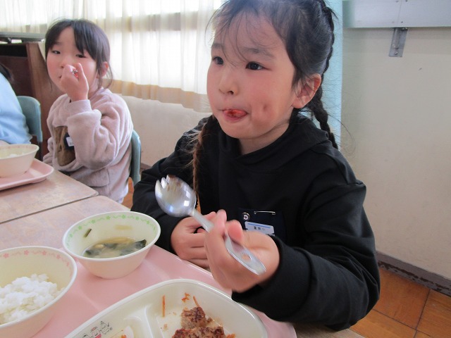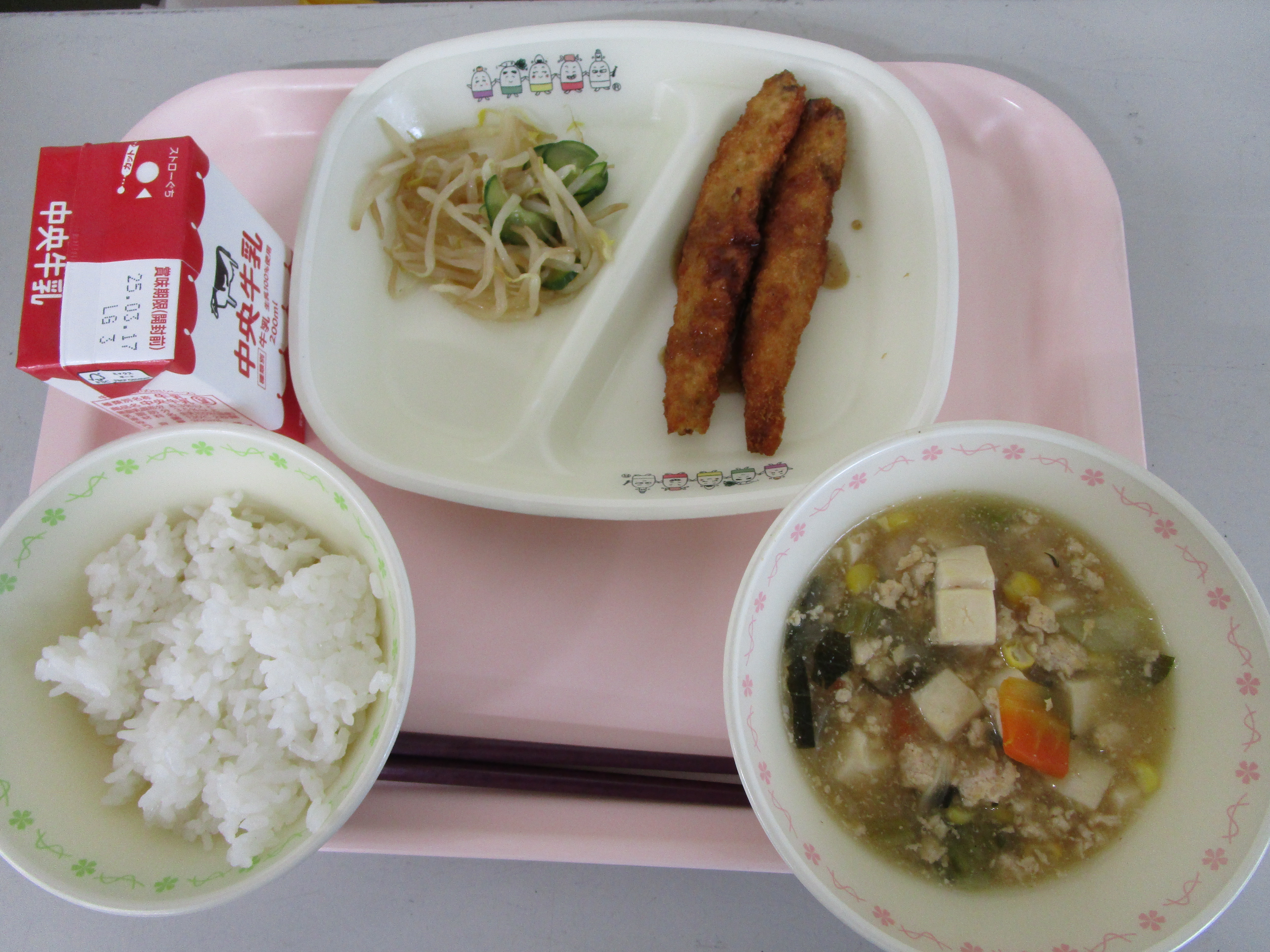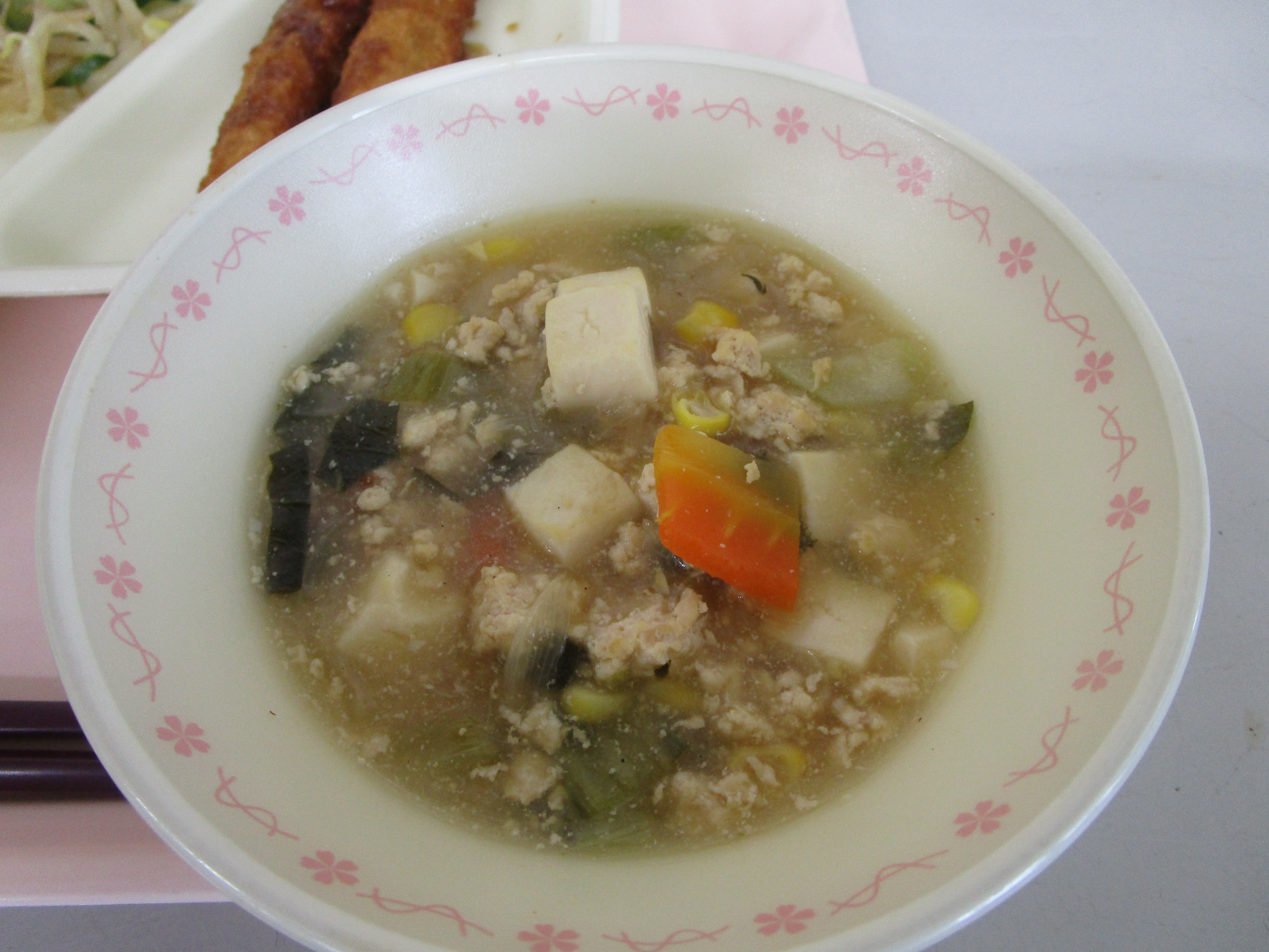 今日の給食には、本校6年生児童の「我が家のじまん料理」である「チンゲンサイのとろとろ煮」が出ました。チンゲンサイの他にも、鳥のひき肉や豆腐、にんじん、たまねぎ、とうもろこしなど具だくさんで、たいへんおいしかったです。しょうがも入っており、体がぽかぽか温まりました。