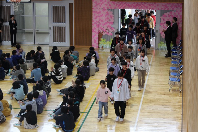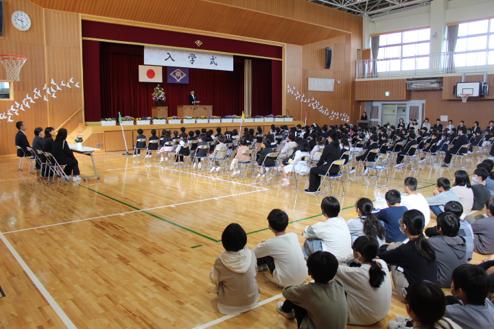 入学式では、106名の新入生を在校生代表の6年生が出迎えました。2年生から6年生は、新しい学年になり、新しい教室での出会いに希望を膨らませていました。