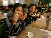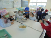 1年生が、28日と1日に2クラスずつ、収穫したサツマイモを調理しました。子どもたちで材料を入れたり、かき混ぜたりしてサツマイモ蒸しパンの生地をつくりました。できあがったサツマイモ蒸しパンをみんなで元気よく「いただきます」をして、おいしくいただきました。