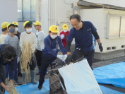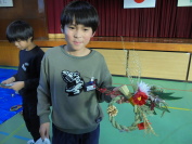 5年生が、秋に行った稲刈り、脱穀に引き続き、稲わらを使ってしめ縄づくりを行いました。稲わらを束ねたものを2つに分け、それぞれの束を締め上げながら、2つの束をねじっていきました。しっかりと締め上げるのがとても難しかったようですが、地域の方に教えていただいたり、クラスの子と助け合ったりしながら作り、すてきな飾り付けもすることができました。