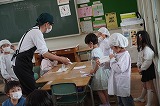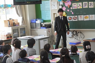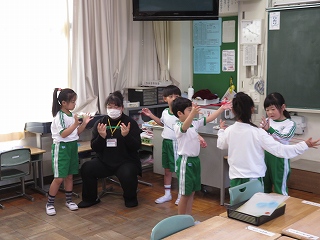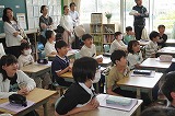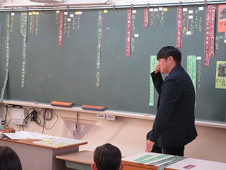 富士松中学校から職場体験学習のために3名の生徒が1年生の教室に来ました。今週末までの3日間、1年生の子たちと触れ合いながら、先生の仕事について学んでいきます。一緒に給食を食べたり、勉強をしたりして一年生の子たちは楽しそうです。 |