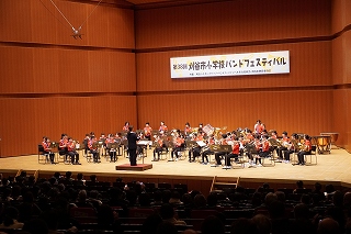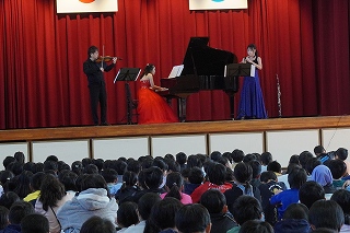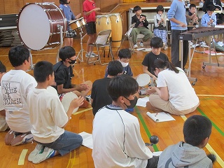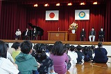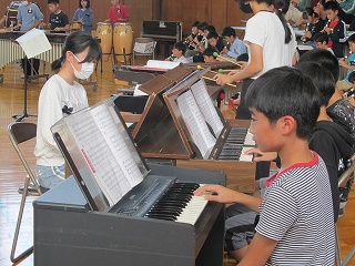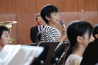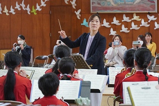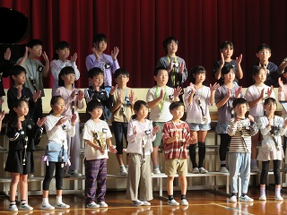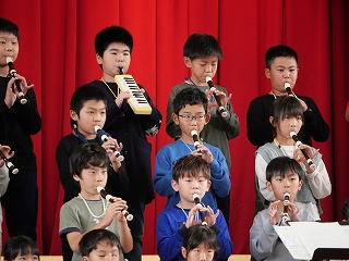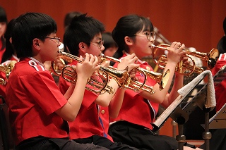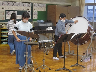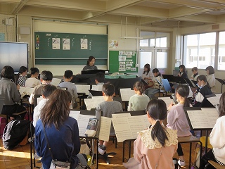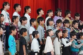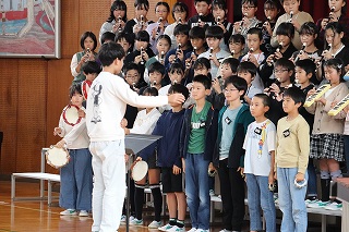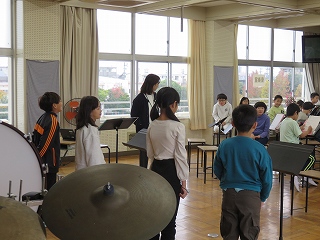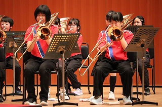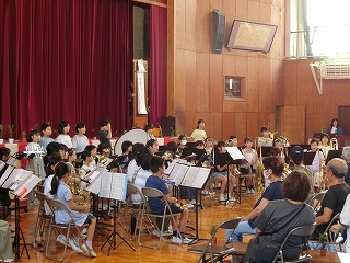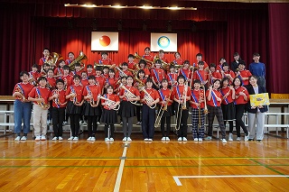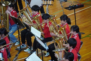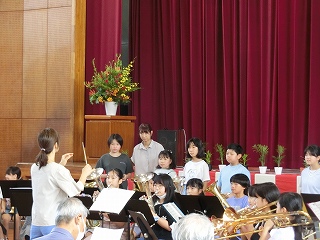 | 日高小学校の体育館で高津波地区の敬老会が行われました。式典の後に金管バンド部の日高っ子たちが、「子犬のマーチ」と「怪獣の花唄」の2曲を演奏しました。久しぶりにたくさんのお客さまの前で演奏することができ、みんなとても嬉しそうでした。演奏後には温かい拍手をいただきました。 |