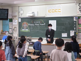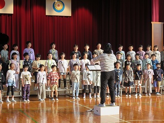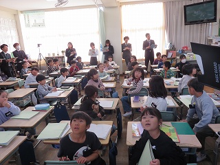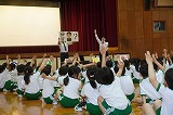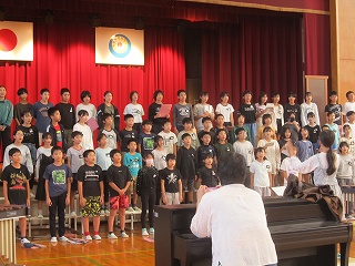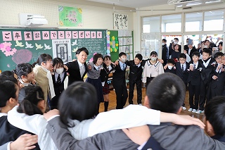 校長先生の誕生日と知り、校長先生をお祝いする日高っ子。「こんなにたくさんの人に祝われるのは初めてです」と、喜んでいました。