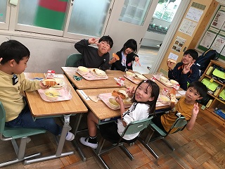 | 今日から1年生の給食が始まりました。サポーターさんと一緒に、ご飯やおかずを食器に乗せたり、食器を落とさないように運んだりして、無事に給食を食べることができました。 |