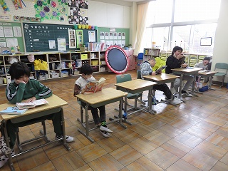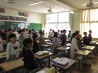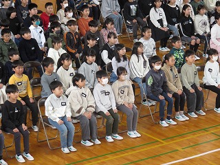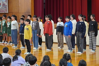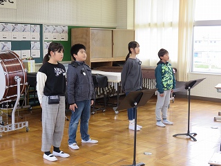 4・5年生が、午後から行われる卒業式の予行演習に備えて、起立・着席・座礼を繰り返し練習していました。みんなの動作がきれいにそろうと、鳥肌が立つぐらいかっこいいです。