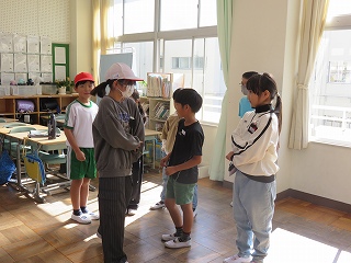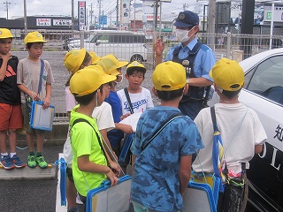 お巡りさんが日高小学校に来て、1年生のみんなにあやしい人へどのように対応するのかを教えてくれました。