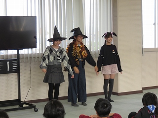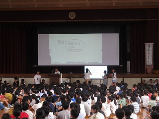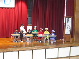 | 9月9日(月)の日高の窓でお知らせした給食委員による「食育劇」。長放課や委員会の時間に、何度も練習を積み、今日本番を迎えました。練習の成果を発揮し、気持ちのこもった迫力ある演技に、全校の児童が盛り上がりました。全校きいてみタイムを通して、健康な生活を送るために、好き嫌いなく、バランスのとれた食事を摂取することの大切さをみんなで考え、勉強しました。 |