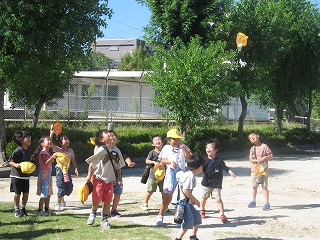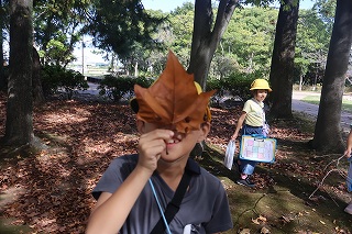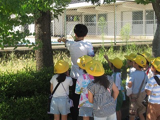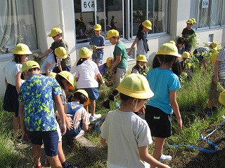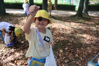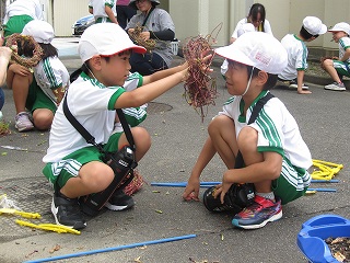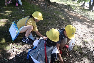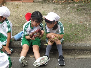 | 1年生が、教材園や日高の森を散策していました。ダンゴムシ、アリの巣、セミの抜け殻、トンボを発見しました。まだまだ暑いですが、夏が終わり、秋の気配がしてきました。 |