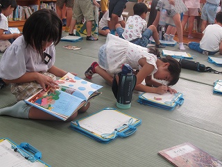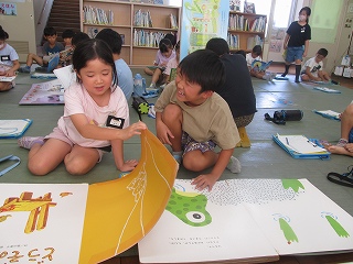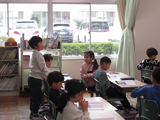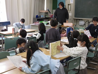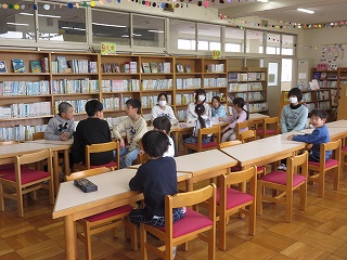 | 2年生が、絵本の森で”ある本”を探していました。ある本とは、神話や昔話が書かれた本です。本棚を見て回って、「これは神話かな?」「これは昔話かな?」とつぶやきながら、本を手に取り、ページをめくっていました。神話や昔話に関心をもち、本を探したり、読んだりする機会を広げてくれるとうれしいです。 |