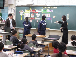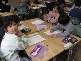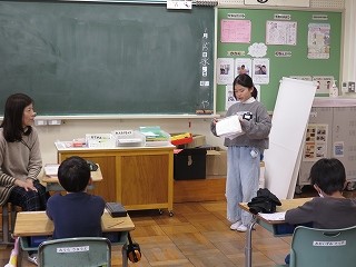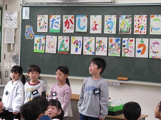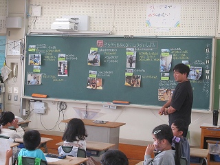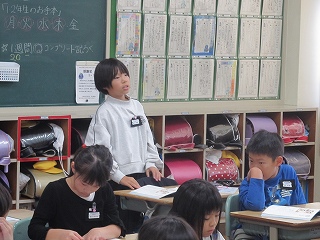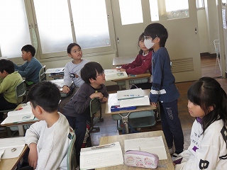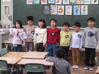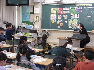 複数回の町たんけんを通して、各グループで分かったことを学級全体で共有しました。10人のきらきらさんについて紹介し、「○○さんの意見と似ていて〜」「○○さんの意見に付け加えて〜」と言葉をつなげ、友達の発表を尊重しながら、自分の考えを述べることができていました。
