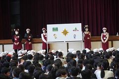 | 長放課にブックママさん主催のクリスマス会が行われました。絵本『もみの木』を題材に、劇を披露してくださいました。最後に、ブックママサンタさんから、この日のために作ってくださった「しおり」のプレゼントがありました。プレゼントをもらった子どもたちはとても嬉しそうでした。 |